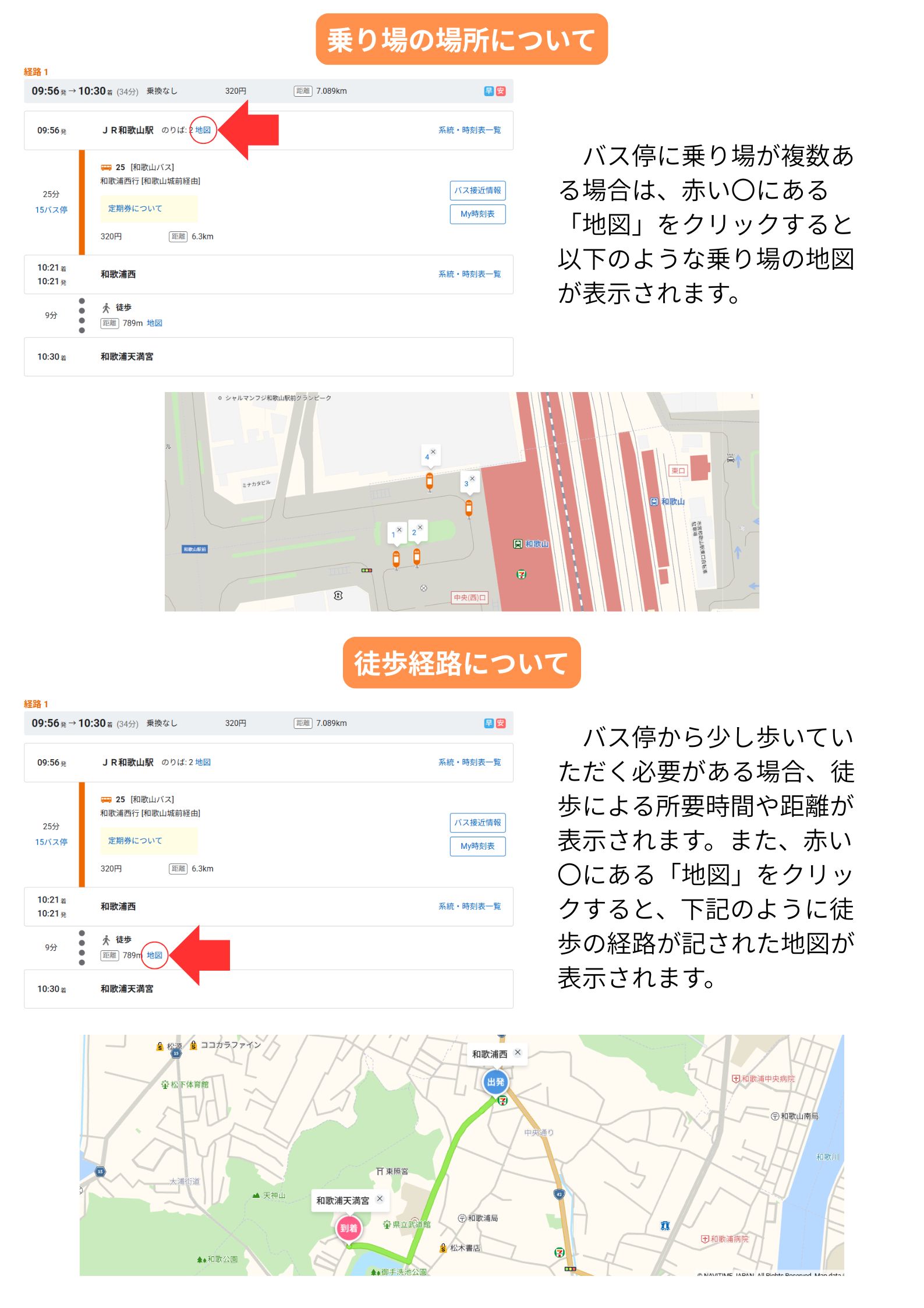 上記鉄道路線・バス路線・施設を含む目的地までのルート案内と、その時刻表の表示および徒歩ルートの地図を表示できます。