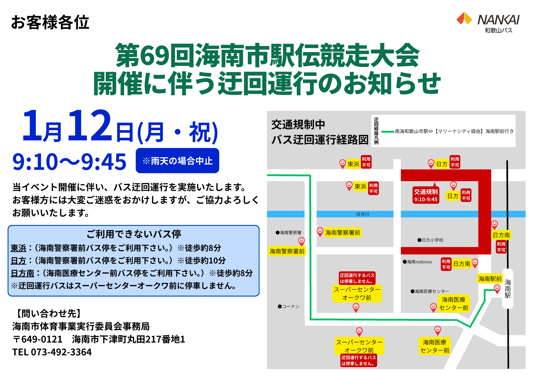 「第69回海南市駅伝競走大会」開催に伴う交通規制のため、一部時間帯で迂回運行を予定しております。ご利用のお客様には大変ご迷惑をおかけしますが、ご協力宜しくお願いいたします。