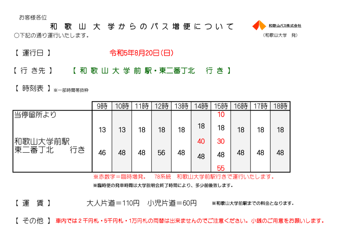 【終了】「和歌山大学説明会2023」実施に伴い臨時増便いたします(8/20実施)