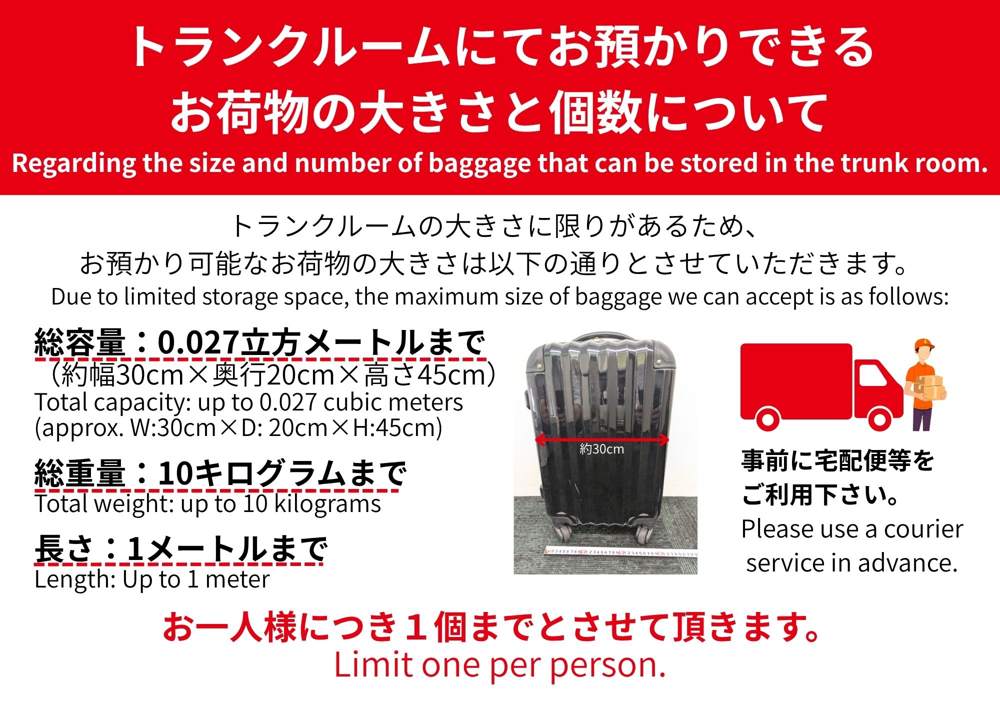 夜行高速バス(千葉線・鎌倉線)におけるお荷物の取扱いについて、お預かりするトランクルームの大きさに限りがございます。改めてトランクルームのご利用条件をお知らせします。