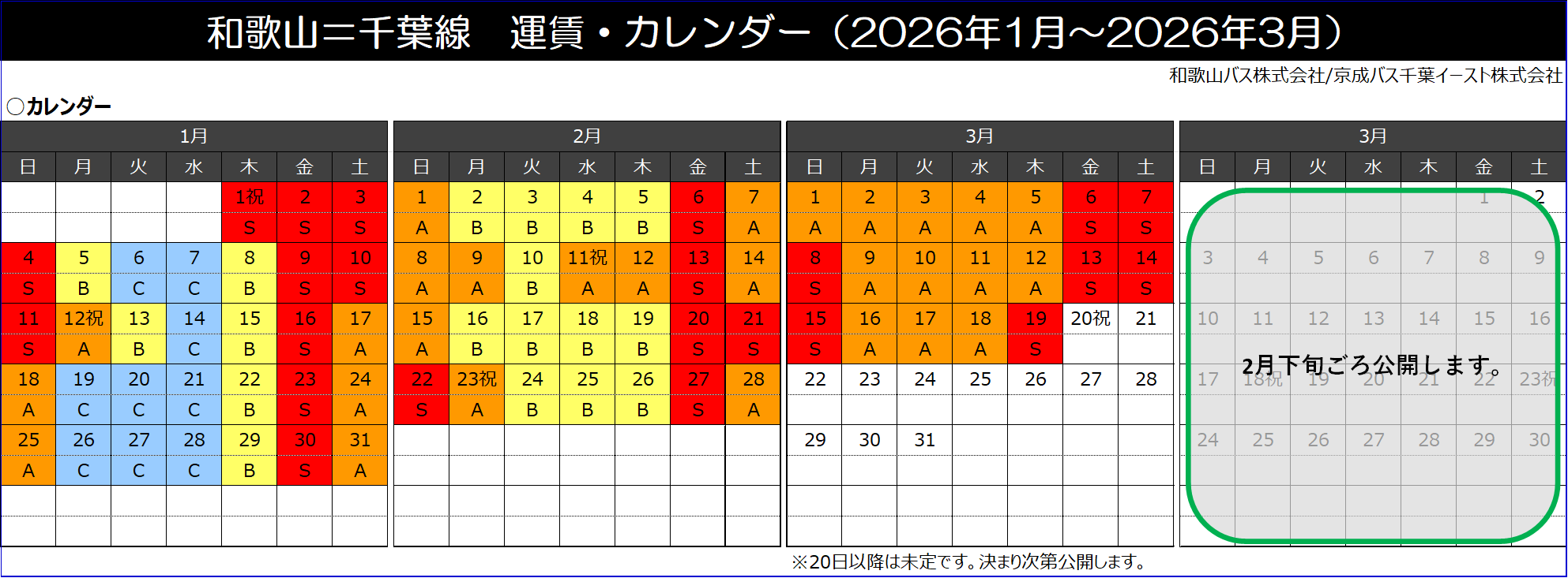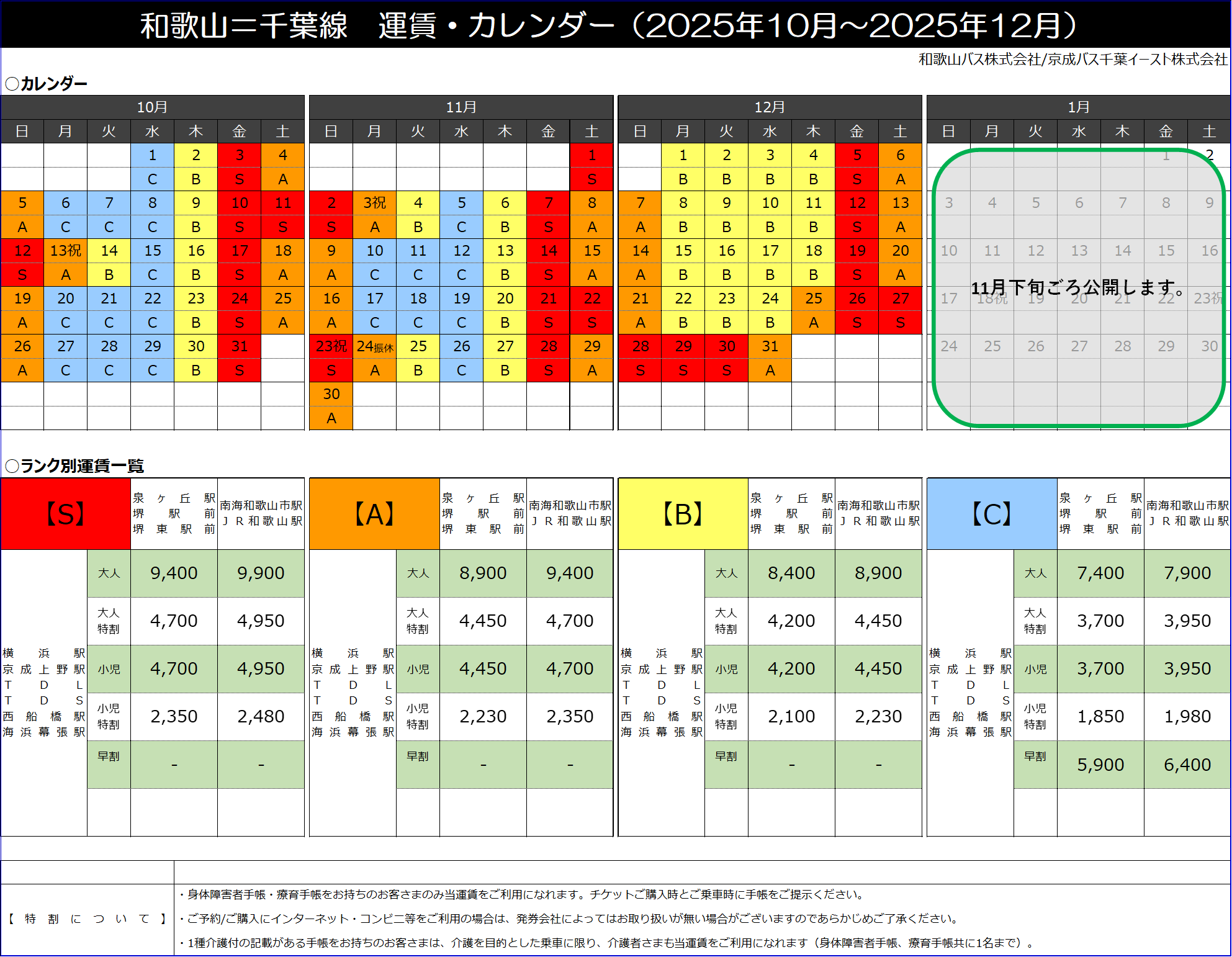 | 南海和歌山市駅 | ↓ | 21:15発 | 海浜幕張駅 | ↓ | 20:00発 |