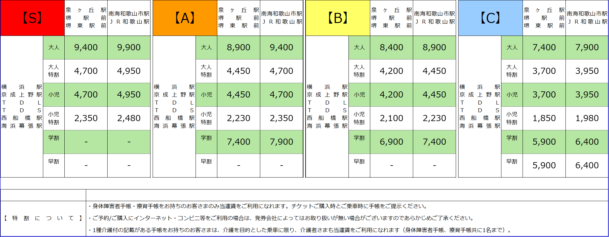 | 堺東駅前 | ↓ | 23:00発 | 京成上野駅 | ↓ | 22:00発 |