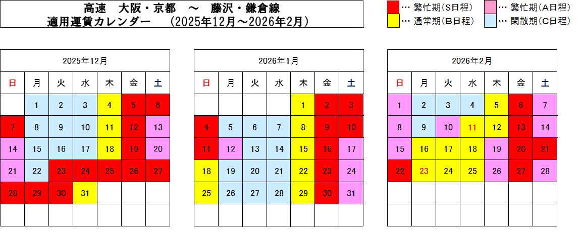 運行日によってS~Cまで運賃が変動いたします。