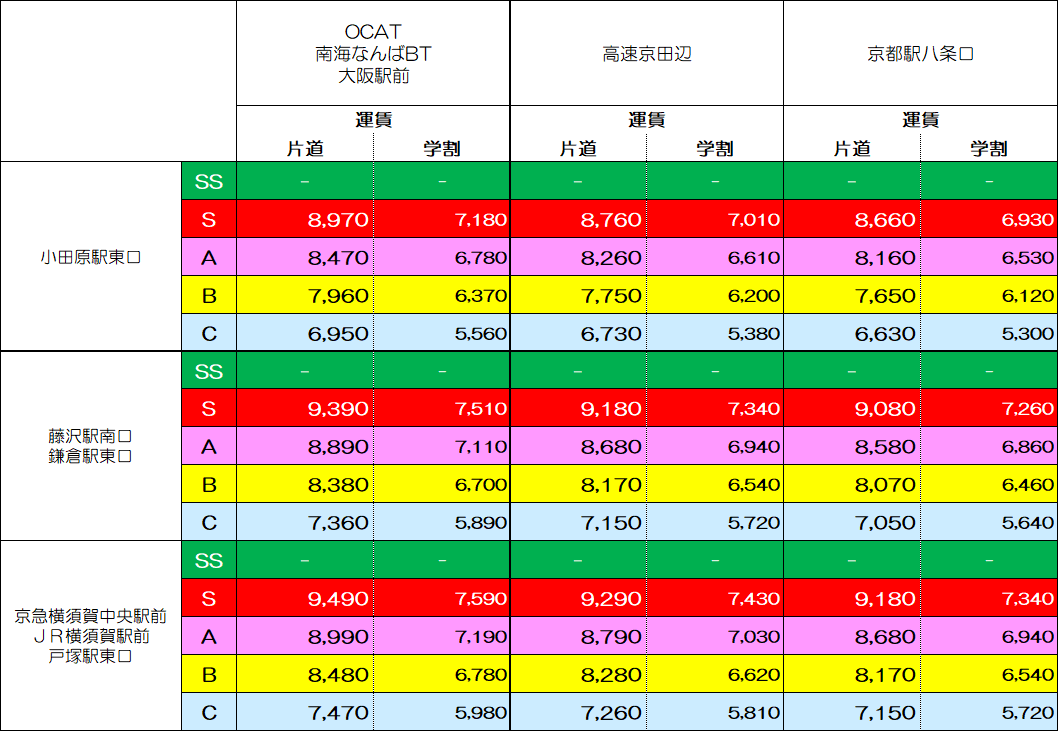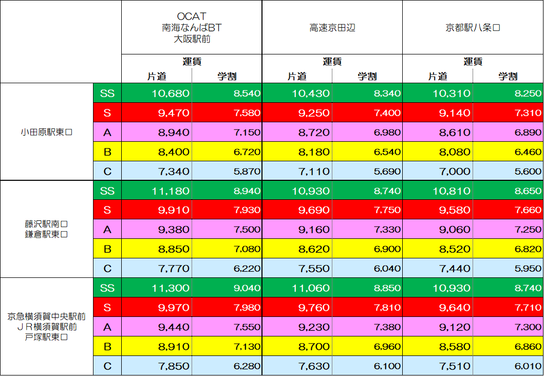 | OCAT→戸塚駅東口 | 戸塚駅東口→なんば高速BT | ||||